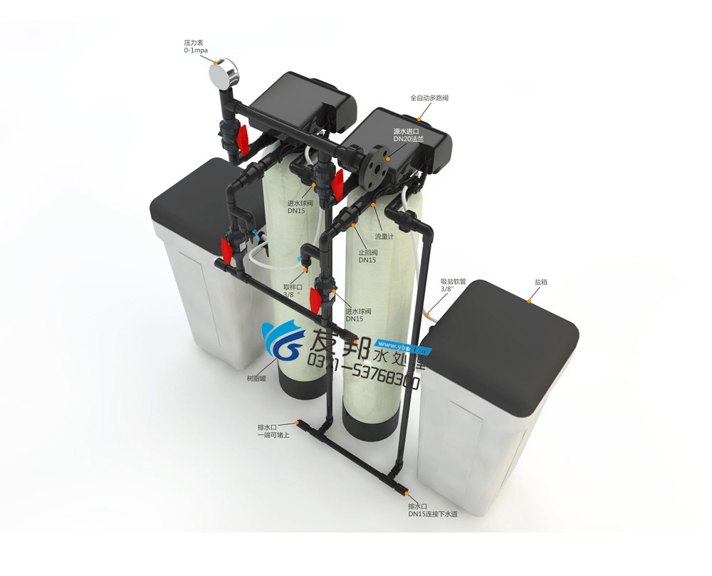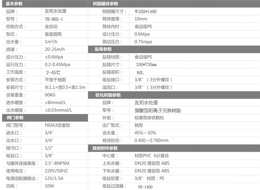 型號:YB-RHS-1,如需24小時連續出水選擇單罐單閥運行,默認樹脂罐體材質為玻璃鋼,如需特殊罐體請說明