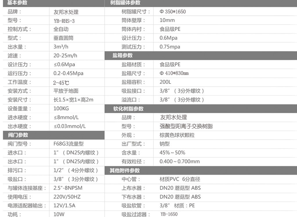 型號(hào):YB-RHS-3,如需24小時(shí)連續(xù)出水選擇單罐單閥運(yùn)行,默認(rèn)樹(shù)脂罐體材質(zhì)為玻璃鋼,如需特殊罐體請(qǐng)說(shuō)明