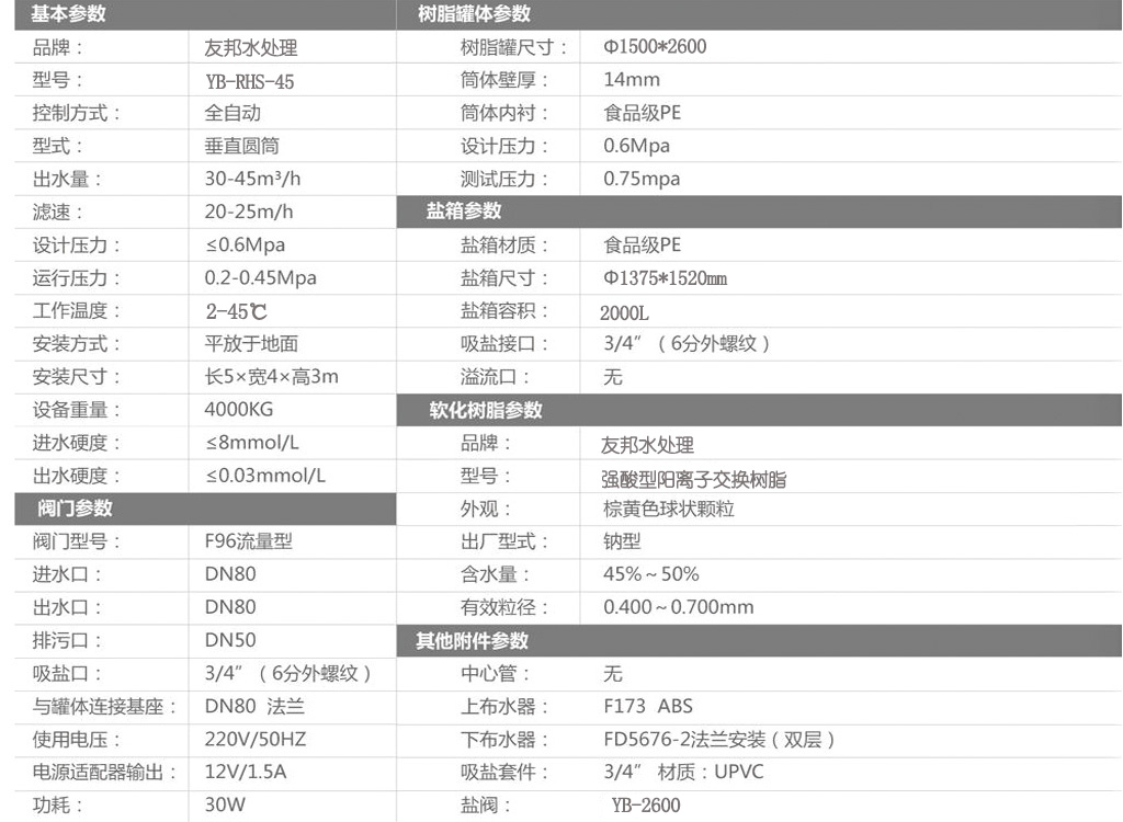型號:YB-RHS-45,如需24小時連續出水選擇單罐單閥運行,默認樹脂罐體材質為玻璃鋼,如需特殊罐體請說明