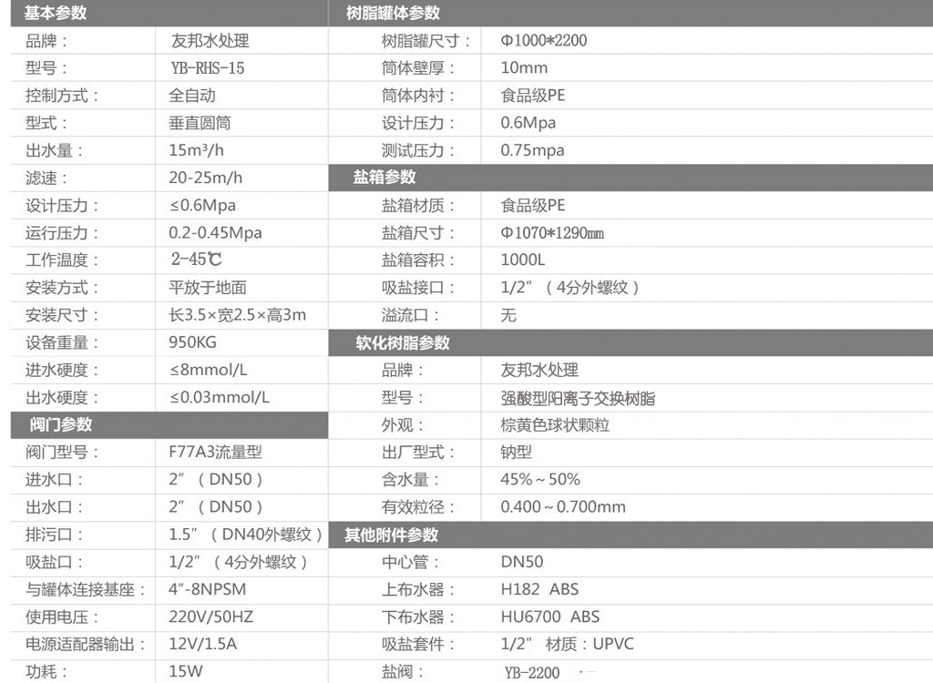 型號:YB-RHS-15,如需24小時連續出水選擇單罐單閥運行,默認樹脂罐體材質為玻璃鋼,如需特殊罐體請說明。