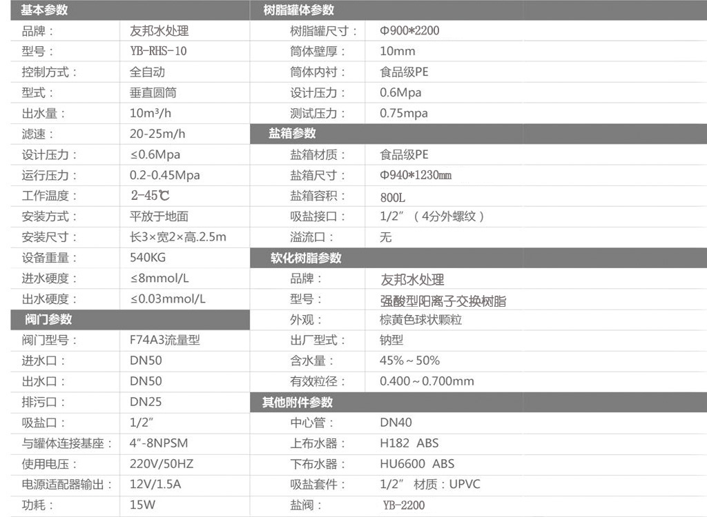 型號:YB-RHS-10,如需24小時連續出水選擇單罐單閥運行,默認樹脂罐體材質為玻璃鋼,如需特殊罐體請說明。