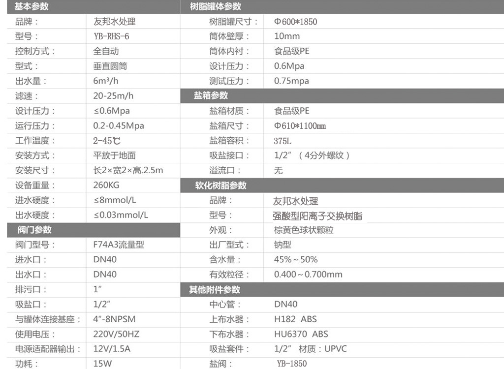 型號:YB-RHS-6,如需24小時連續出水選擇單罐單閥運行,默認樹脂罐體材質為玻璃鋼,如需特殊罐體請說明。