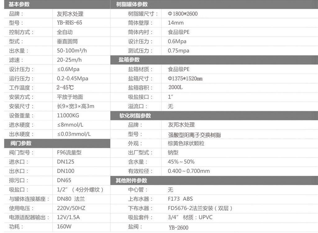 型號:YB-RHS-65,如需24小時連續出水選擇雙罐雙閥并聯運行,默認樹脂罐體材質為玻璃鋼,如需特殊罐體請說明。